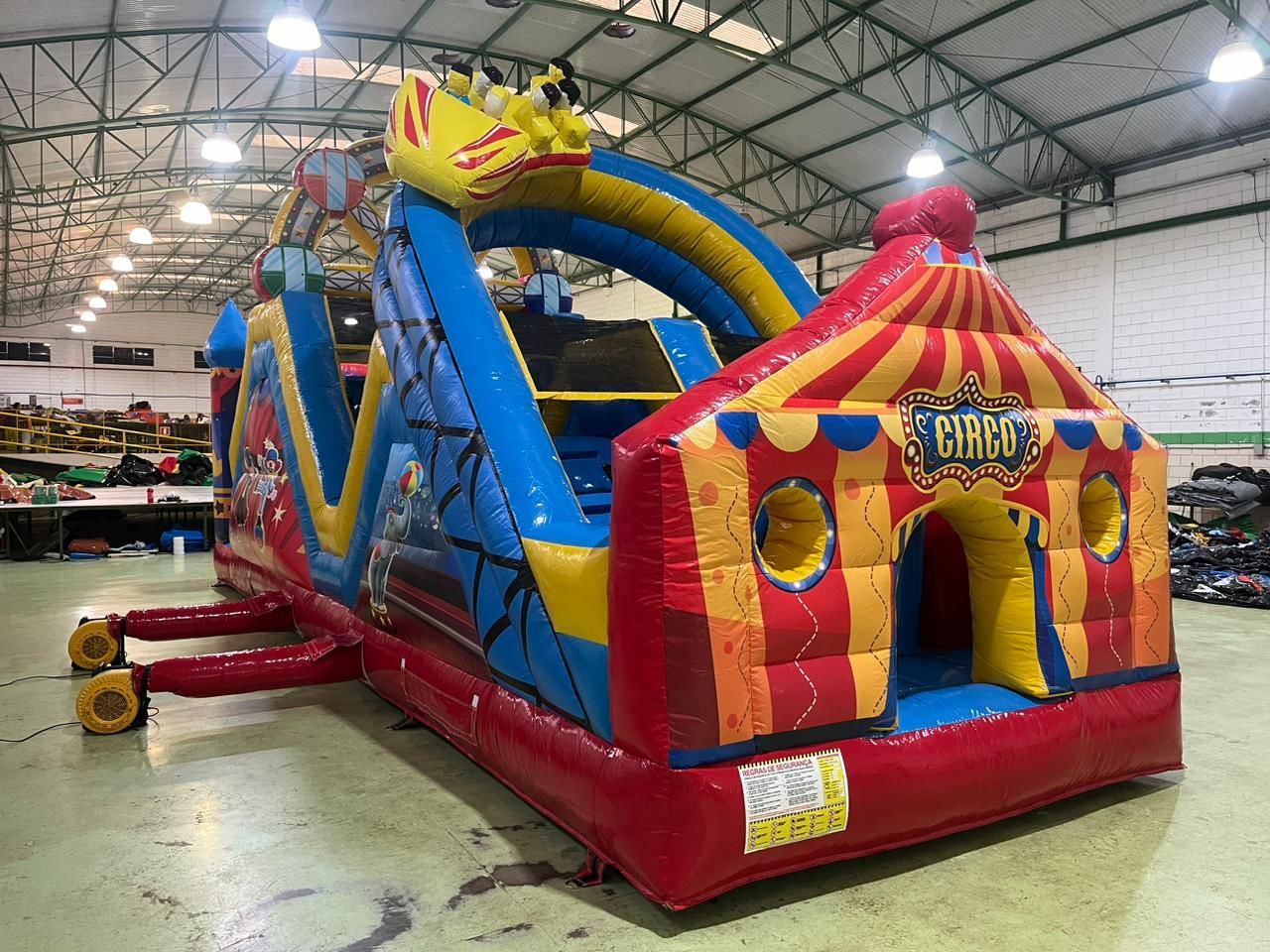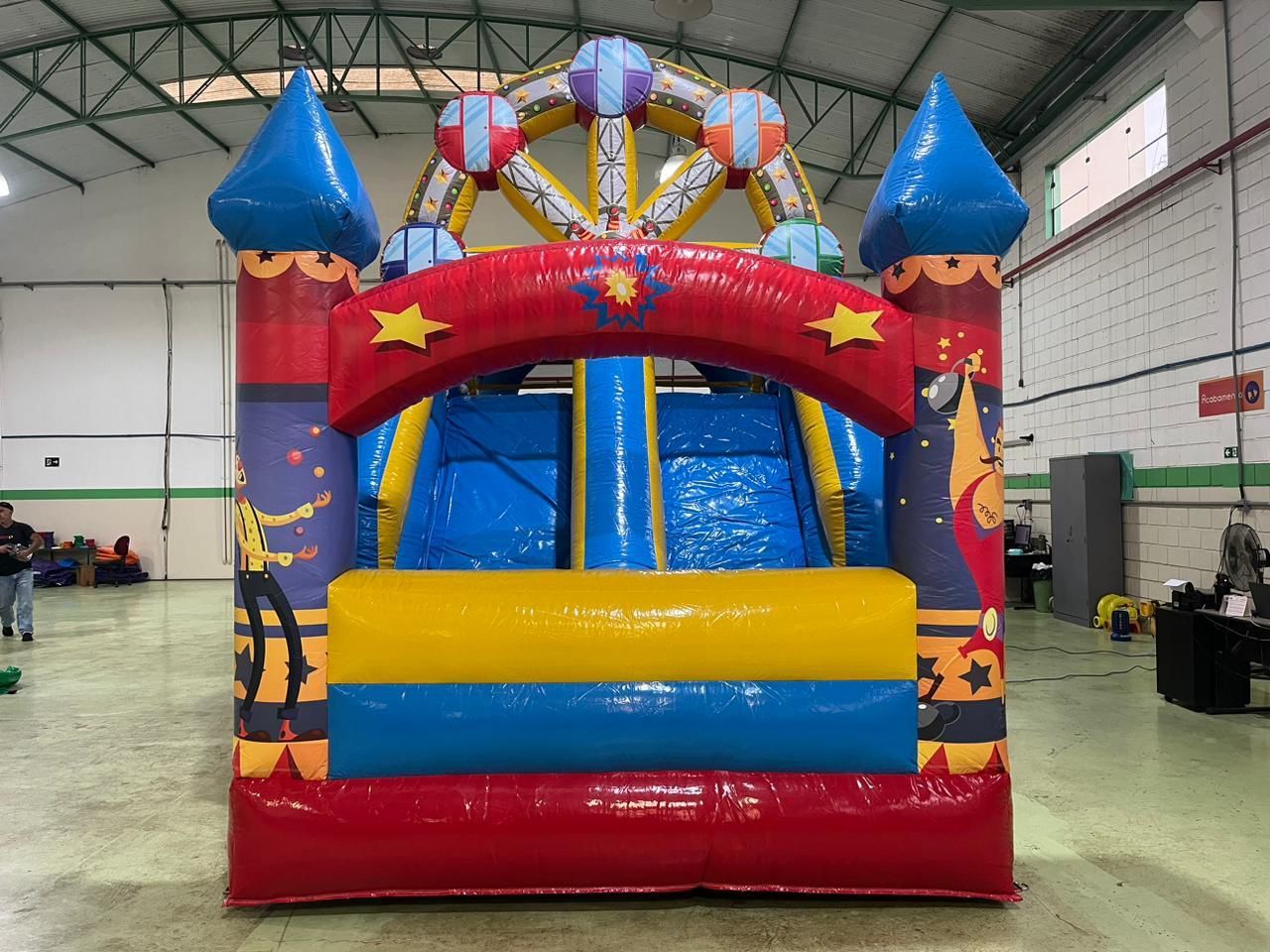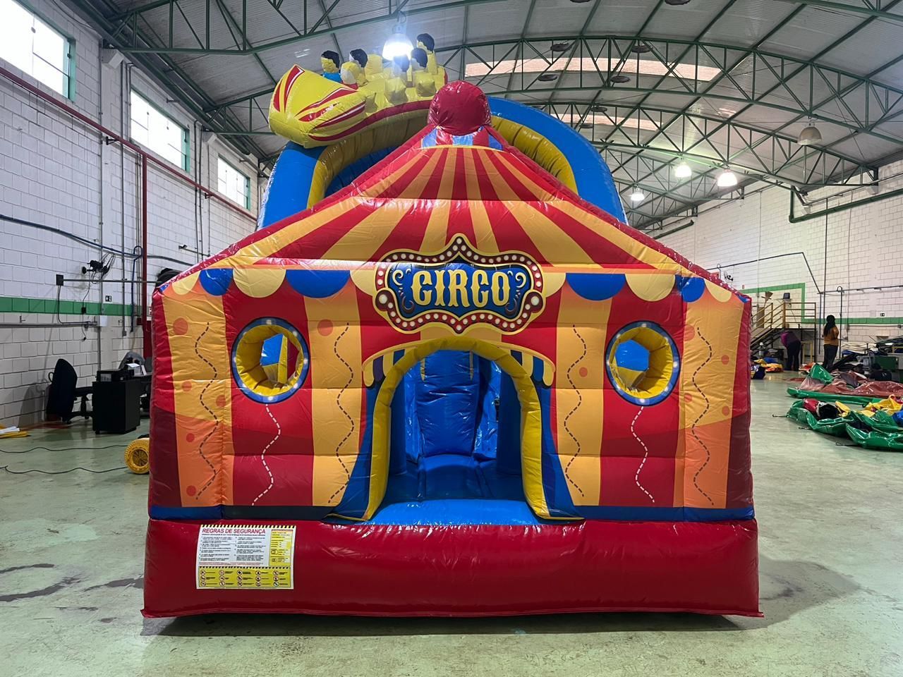 Entre no mundo mágico do circo com este super tobogã inflável de cores vibrantes e temática encantadora!